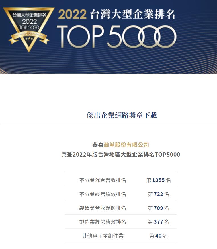 Ranked in the 2022 edition of Taiwan's TOP5000 Large Enterprise Rankings.