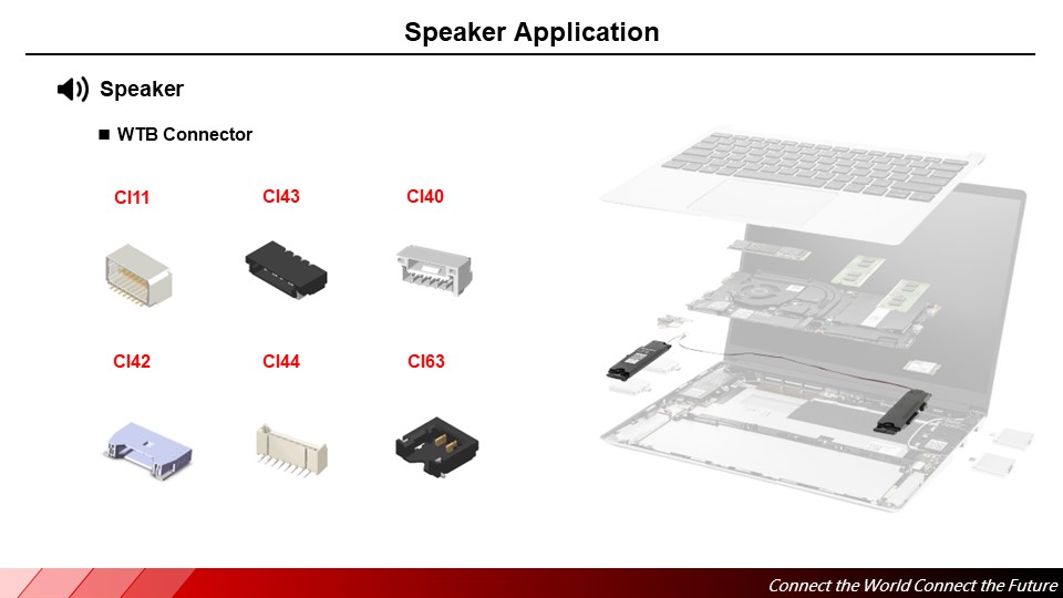 In laptops, the speaker module is a crucial component responsible for playing audio. These modules are typically embedded in the laptop's chassis or integrated into the display area, providing users with audio output capabilities. The quality of the speaker module directly influences the clarity and sound quality of audio, playing a key role in delivering a rich audio experience. CviLux's connectors and related solutions ensure the stable transmission of audio data, thereby delivering high-quality audio performance. Our connectors are designed to safeguard the integrity of audio signals, enhancing the sound output of your laptop.